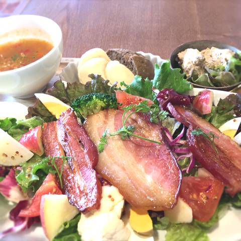 季節限定ベ-コン焼きと季節の野菜 ミネストロ-ネ 焼き立てブレッド食べ放題フランス産オリヴオイルカフェ付き