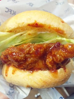 醤だれチキンサンドを初オーダー! 写真の通り、バンズから飛び出るボリューム感はケンタならではでしょう。 味の方は。。。 ピリッと甘辛だれで、結構濃い~かなという感じですが、バンズと合わさればちょう…